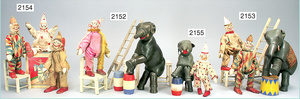 SCHÖNHUT Humpty-Dumpty, 3 Teile, 1 Elefant, 22 cm, große Serie, Glasaugen, Orig.-Decke, Orig.-Rüsselspitze, dazu 2 Clown-Figuren, 22 cm, Orig.-Kleidung, altersbedingt Lackfehler, 2 Stühle 1 Leiter, 1 Podest