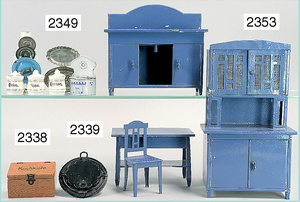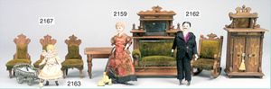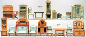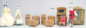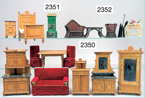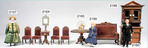 Puppenstuben-Möbelprogramm, Schrank, 30 cm hoch, Sofa 15,5 cm breit, 4 Stühle, Tisch, kl. Nähtisch, ca. 1910
