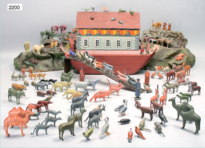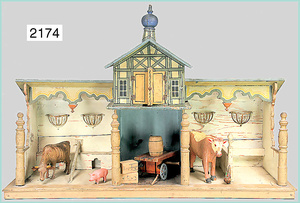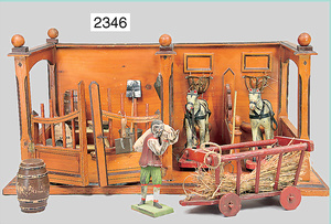 schöner Manufaktur-Stall, ca. 1890, 77 cm breit, 55 cm hoch, Orig.-Bemalung, dazu 2 frühe Zugochsen, Holz, 1 Leiterwagen
