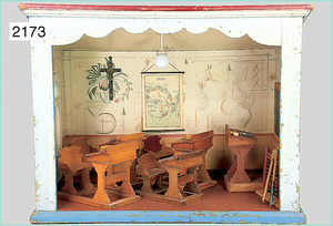 Puppenstuben-Schule, 53 cm breit, 42 cm hoch, 34 cm tief, mit Dach, schöne alte Bemalung, Schulbänke, Tafel, Zubehör, früh