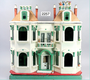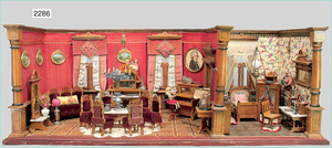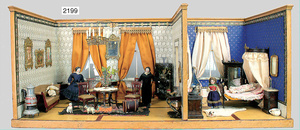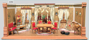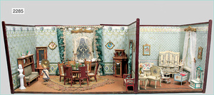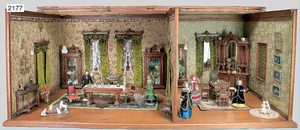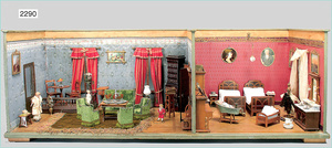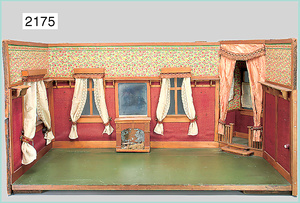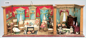 2-telige herrschaftl. Puppenstube, 79 cm breit, 31 cm hoch, 34 cm tief, ca. 1880, schöne Außenbemalung, Orig.-Tapeten an Wand und Boden, 3 Fenster, aufwendig gearbeitete Zinn-Gardinenblenden, Durchgangstür, Türflügel ergänzt, sehr dekorativ
