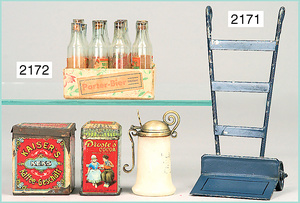 Kaufladenzubehör, Bierkrug mit Deckel, 1 Keksdose, Blech, Papier beklebt, 1 x Kakaodose, Blech lithogr., dazu 1 Flaschenhalter