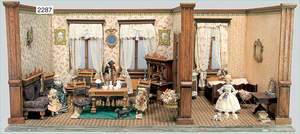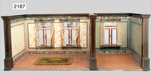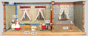 2-teilige Puppenstube, 95 cm breit, 40 cm hoch, 3 Fenster, alte Tapete an Wand und Boden, verzierte Frontleisten, Orig.-Zust., ca.1890