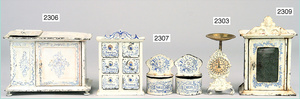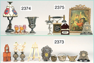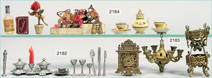 Puppenstuben Zubehör, kl. Zinnuhr, 6 cm, Vogelkäfig, 5,5 cm, Kaffeeservice, Kelch, Zinnschale