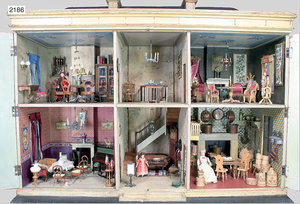 Puppenhaus, ca. 1860, England, 1,25 m breit, 95 cm hoch, 44 cm tief, Orig.-Außenbemalung, Fassade zum Öffnen,Treppenaufgang, Küche, 3 Zimmer mit jeweils fest eingebauten Kaminen, Tapeten teilweise neuer, schöne Deckenbemalung, hochwertig möbliert, reichhaltig Zubehör, Leuchter Messingblech vergoldet, Zinn oder Holz, frühe Rock & Graner Stühle, Biedermeiermöbel, einige Teile Messingblech vergoldet, Küche mit Kupfer, Messing, Zinn und Holzteilen, museal