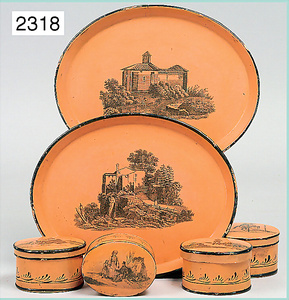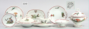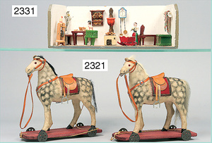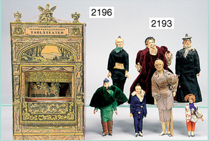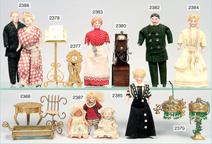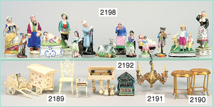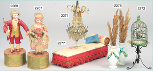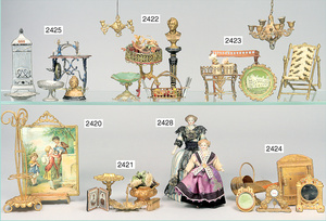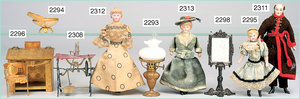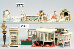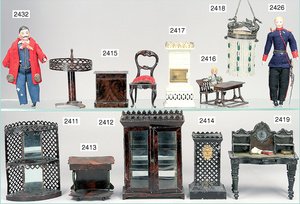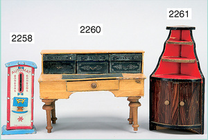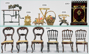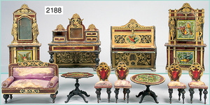 hochwertiges Puppenstuben-Möbelprogramm, Holz, mit lithogr. Papier beklebt, prunkvoll gearbeiteter Sekretär, 14 cm breit, 16 cm hoch, Spiegelglas abgegriffen, 1 Schublade fehlt, Klavier, 14 cm hoch, Schrank, 18 cm, seitl. Figuren, Vogelmotive, dazu passend 1 Spiegel, 2 Tische, Sofa, 13 cm, Seide altersbed. verschlissen, 4 Stühle, Seide altersbed.verschlissen, außergew. Dekor, Orig.-Zust.
