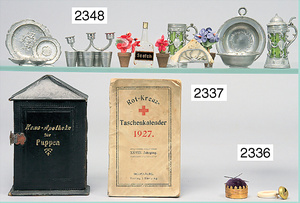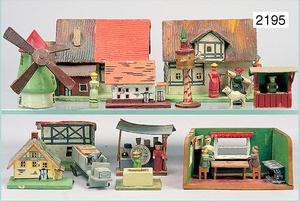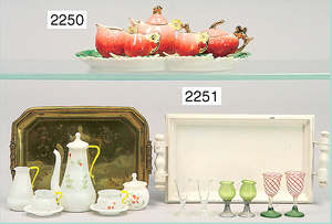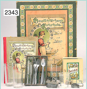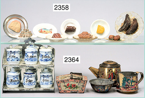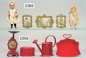 Konv. Puppenstuben-Ausschmückungsteile, 3 Teile ERZGEBRIGE, 2 Tassen mit Untertasse, 1 Kaffeekanne beschädigt, 1 Glasflasche, Lesefibel, Fernglas, 2 Blumenkästen