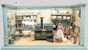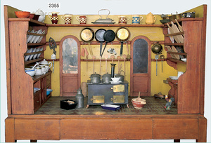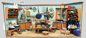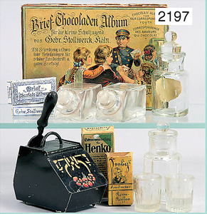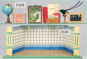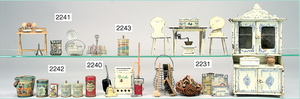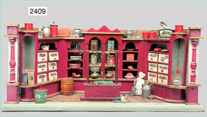 Kaufladen, Jugendstil, 74 cm breit, 31 cm hoch, 28 cm tief, seitl. Schubladen mit geschwungenen Blechschildern, verzierte Frontleisten, alte Tapete an Wand und Boden, alte Bemalung, Theke ergänzt, mit teilw. hochwertigem Zubehör