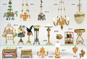 Puppenstuben-Ausschmückungsteile, Zinn, Anbietschale, Zinn/Glas montiert, 4,5 cm, 1 Blumentisch, Zinn-Blumenkorb, 3-armiger Leuchter, 1 Ständer mit Büste