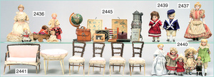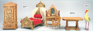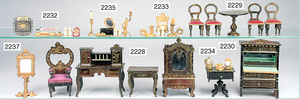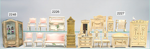 Puppenstuben-Schlafzimmer-Programm, Jugendstill, 2 Betten, 12,5 cm, 2 Nachttische, Kleiderschrank 15 cm, 1 Spiegelkommode, 2 Stühle