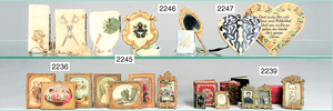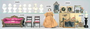 Konv. Puppenstuben-Ausschmückungsteile, kl. Spiegel, Zinn, 9 cm, 2 Puppenstuben-Bilder, 1 davon Glas gebrochen, kl. Nähtisch, silber, 5,5 cm, kl. Büste, kl. Silberschatulle, filigran gearbeitet, Kleinteile