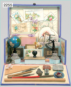 herrschaftl. Schreibtisch, Holz/Zinn montiert, 12 cm breit, filigran gearbeitet, dazu einige Teile Zubehör