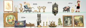 Puppenstuben-Ausschmückungsteile, kl. Staffelei, 2 Bilder, Tisch mit Biskuit-Büste, 12,5 cm, 1 Kaminuhr mit Glassturz