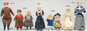 Puppenstuben-Puppe, Haushälterin, 14 cm, Biskuit-Brustblattkopf, -Arme und -Beine, stark ausmodellierte Frisur, anmodellierte Schuhe, schöne Orig.-Kleidung