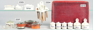 Konv. Puppenküchen-Ausschmückungsteile, passend für kl. Küche, ROCK & GRANER Wandhalter, 6,5 cm, Backform, Keramik, 3-Bein Pfanne, Blech, Besteckteile, Zinnteile, kl. Gewürzkasten, Weißblech