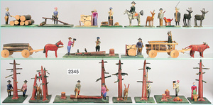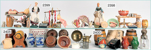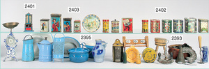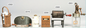 Konv. für gr. Puppenküche oder Kaufladen, 2 Holzfässer, 10 cm, Säcke, Keramikkannen, Kohlenschütte, 1 Buttermaschine, Glas gesprungen