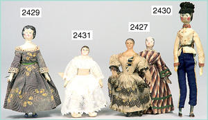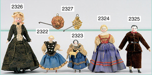 2 Teile Puppenstuben-Puppen, früh, Papiermaché-Köpfe, gegliederte Holzkörper, 11 cm, Orig.-Bemalung mit altersbed. Lackabplatzern, Orig.-Kleidung, ca. 1820