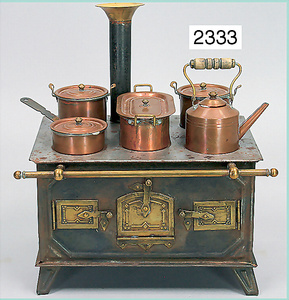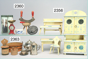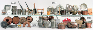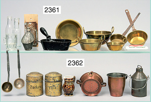 Puppenküchenteile, Backform, Bräter, Sieb, Eimer mit Deckel, Dose mit Deckel, Metze, Brotschneidemaschine, einige Messingteile, Eierständer