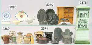 Puppenstuben-Ausschmückungsteile, Zinn-Nähmaschine, 6,5 cm, filigran gearbeitet, kl. Zinn-Ofen, Büste, 2 Schalen