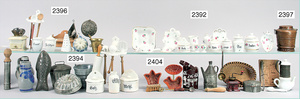 Konv. Puppenküchenteile, Keramik, Kupferformen, Schüsseln, Holzfass, 8 und 9,5 cm
