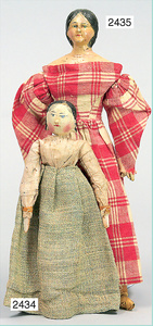 2 Puppenstuben-Puppen, Haushälterin, 15 cm, Biskuit-Brustblattkopf, -Arme und -Beine, beide Füße weggebrochen, alte Kleidung, Kleidung etwas verschlissen, 1 Haushälterin 15,5 cm, Biskuit-Brustblattkopf, -Arme und -Beine, Stoffkörper, 1 Hand weggebrochen, Orig.-Kleidung, mit Zinnschlüsseln