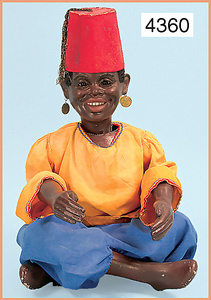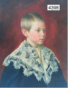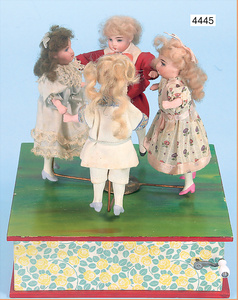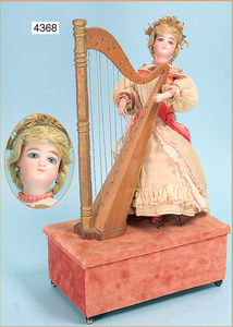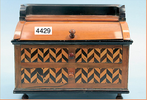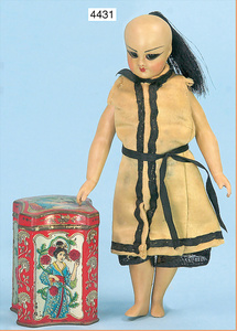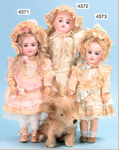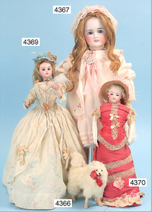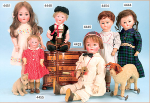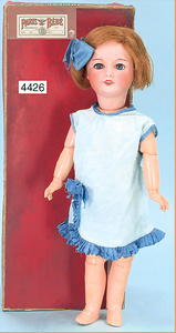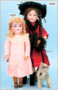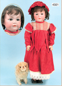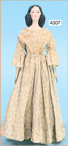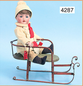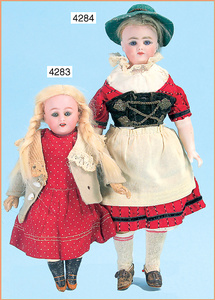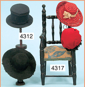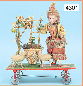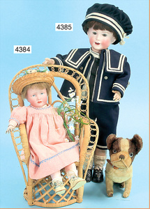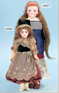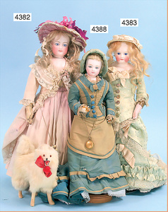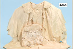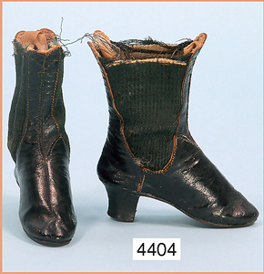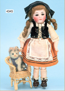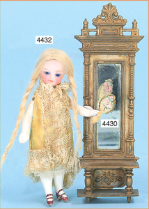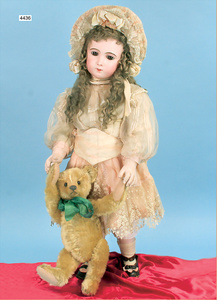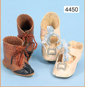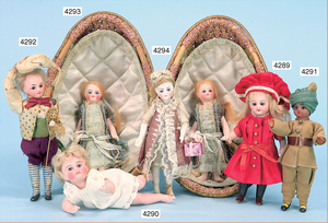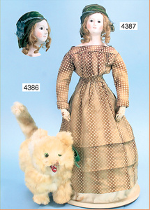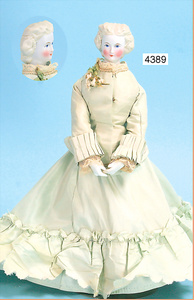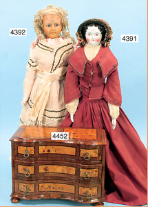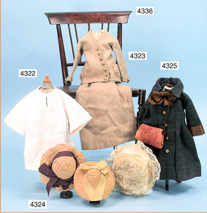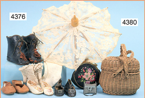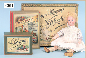 Modepuppe, Frankreich, ungemarkt, 29 cm, Biskuit-Kurbelkopf, blaue festeingesetzte Glasaugen, geschl. Mund, durchstochene Ohren, auf Biskuit-Brustblatt, Lederkörper mit leicht eingeknickten Beinen, separat abgenähte Finger (2 Finger fehlen), alte Kleidung u. Schuhe, dazu passender Hut, Mohairperücke, unter Glassturz, mit zweitem Paar Schuhe, Strümpfe, Tasche, 1 Waschtisch mit Spiegel, Kleinteile
