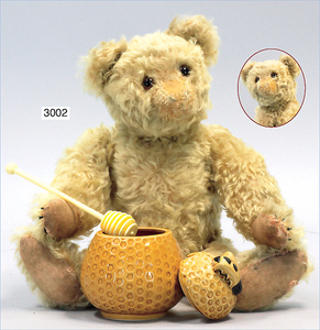 STEIFF Orig.-Bär, mit Knopf, Schild und Fahne, Nr. auf der Fahne 5340,01, gold/gelb, minimale Fehler an den Filztatzen, schönes volles Mohair, Glasaugen, kl. angesetzter Buckel, 35 cm, schöner Ausdruck