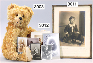 STEIFF Mittelkopfnaht-Bär, ca. 1928, mit Knopf minimale Reste der roten Fahne, Vorkrieg, 65 cm, Glasaugen, lange abgeknickte Arme, Buckel, Filztatzen in gutem Zust., maisfarben, schönes volles Mohair, Kippstimme, selten, sehr guter Zust.