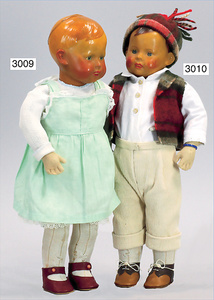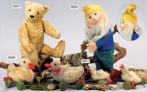 STEIFF Puppe, Schlopnie, Junge, anhand der nicht Orig.-Kleidung, Name nicht mehr feststellbar, ca. 1925, Celluloidkopf (Schildkröt in Raute) in aprikot technik, '' von innen bemalt und mit Holzwolle gestopft '', drehbar, 38 cm, der Köper ist weich gestopft und mit Wollfilz überzogen, Filzweste, Cordhosen, Lederschuhe, Fehler an der Filzhand, selten