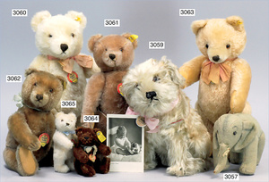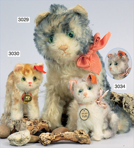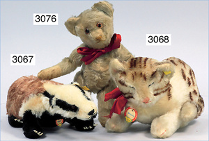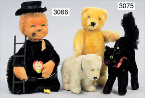 STEIFF 3 Teile, kl. Orig.-Teddy, gelb, 20 cm, ohne Knopf und Fahne, ohne Schild, kl. Eisbär, 15 cm, Drehkopf, ohne Knopf und Schild, 1 schwarzer Kater, mit Knopf, ohne Schild und Fahne, guter Zust.