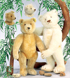 STEIFF Mittelkopfnaht-Bär, mit Knopf, 1910, weiß, helle Nasenbestickung, Schuhknopfaugen, 46 cm, lange abgeknickte Arme, Buckel, an vereinzelten Stellen etwas Mohairverlust, Filztatzen an einer Pfote etwas ausgebessert, sonst guter Zust., schöner Ausdruck