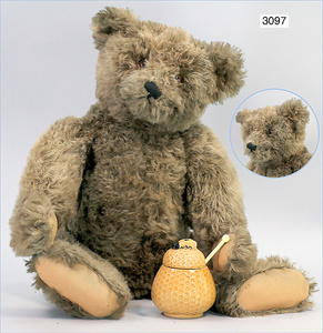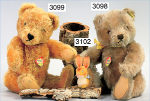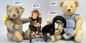 STEIFF Braunbär, ca., 1930, mit Knopf, und Fahne, Nr. auf der Fahne ist 1318,02 H, 30 cm lang, Kopfdrehmechanik, auf 4 Pfoten, Filztatzen in gutem Zust., an wenigen Stellen etwas Mohairverslust, ausgefallen