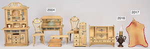 Puppenküchen-Möbelprogramm, um 1900, Schrank, Höhe 29 cm, 2 Stühle, Tisch mit Aufsatz, Hängeschrank, Schrank mit Tür und Schubladen, Bank, Wichskasten, Zubehör, 3 Schubladen fehlen, sonst gut