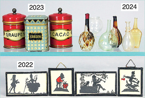 Konv. Puppenküchen-Ausschmückungsteile, Petroleumkanne, Blech, 7 cm, Essig- und Ölkaraffe, Heringsdose, Metze mit Deckel, Kanne, 3 Dosen mit Deckel