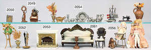 Puppenstuben-Ausschmückungsteile, kl. Nähmaschine, 6 cm, Kehrblechhalter, Vase, Zinnserviceteile