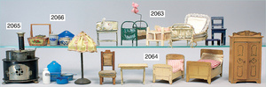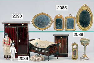 3 kl. Betten, 4,5 cm, dazu 3 kl. Ganzbiskuitpuppen, kl. Blech-Bücherschrank, 9,5 cm, Vogelkäfig, Zinn, 1 Spiegel