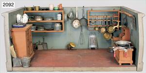 Puppenküche, vor 1900, 69 cm breit, 29,5 cm hoch, 45 cm tief, Regale, Waschtisch, Brotschrank, Orig.-Bemalung, reichh. Zubehör, Weißblechteile, Kupferteile, Messingteile, Keramikteile