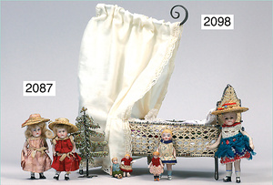 Spielszene für die Puppenstube, kl. ausgef. Ganzbiskuit-Charakterpuppe, gemarkt 810, 10,5 cm, braune fest eingesetzte Glasaugen, geschl. Schmollmund, Ganzbiskuit-Körper, 4 Ganzbiskuitpuppen, 4 cm bis 7 cm, 2 Ganzbiskuit-Puppen, 8 cm, schöne Orig.-Kleidung mit Hut, dazu 1 Weihnachtsbaum, Zinn
