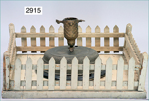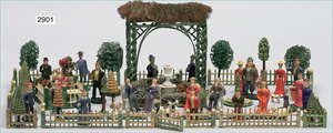 ERZGEBIRGE Lustgärtlein, um 1900, Massefiguren auf Holzsockel, 5,5 cm bis 6 cm, 24 Teile Passanten dazu, Zaunteile, Luffabäume, Gartenteile, Blumentöpfe, Spanbäume, Torbogen, Tische und Stühle, einige Hunde, in alter Spanschachtel