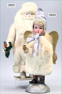 Weihnachtsengel, 52 cm, Masse-Sockel, Papiermaché-Körper mit Holzhänden, Biskuit-Porzellankopf, blaue fest eingesetzte Glasaugen, off. Mund, Zähne u. Zunge, Fellkleidung, Holzflügel