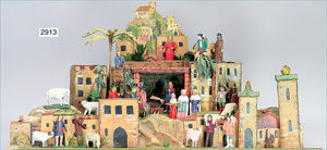 Weihnachtsberg, Holz, Papiermaché, aufwendig gestaltet, reichh. Figuren, 20 Personen, viele Tierfiguren, Grulich u. a., 10-11,5 cm, Könige, versch. Berufe, Jesuskind, dazu viele Tierfiguren, dazu 1 Palme