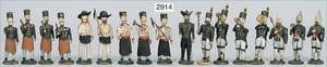 ERZGEBIRGE Reiterschwardrohnen, 10 Teilig, ca 1910, 9 cm, Holzfiguren mit Nase, 3 Musiker, 1 Fahnenträger, Arm an einer Figur fehlt, sonst sehr schöner Orig., Zustand, in alter Spanschachtel