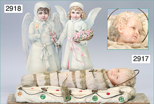 3 Teile Christbaumschmuck, Watte, Krepp, Oblatenbilder, 2 Engel, 10,5 cm u. 13,5 cm, dazu 1 Kind mit Muff, 15,5 cm
