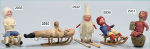 Christbaumschmuck, Heubach, Biskuitkopf, Watte-Körper, Kreppkleidung, auf Schlitten sitzend, 9 cm