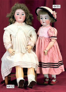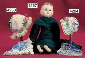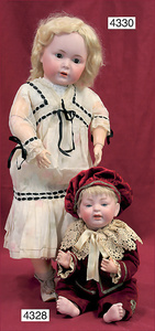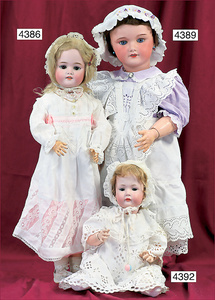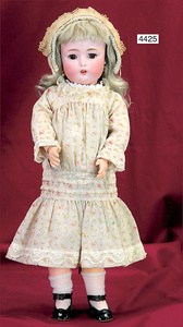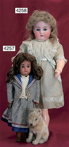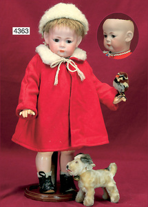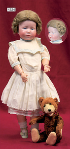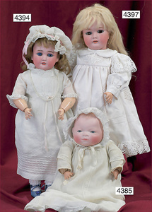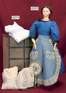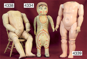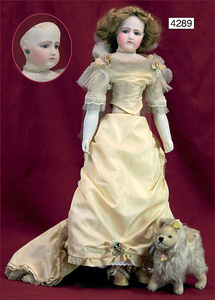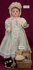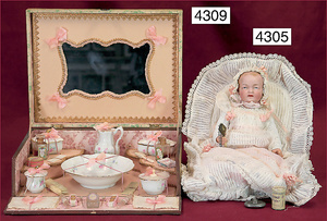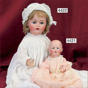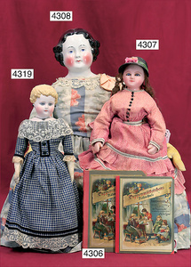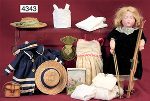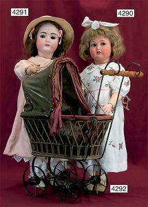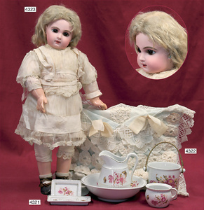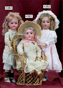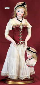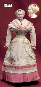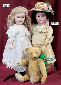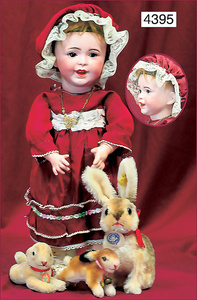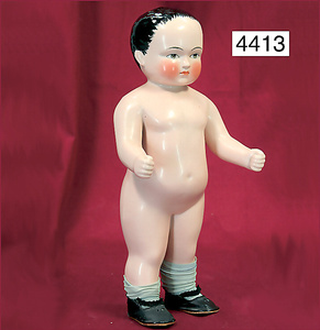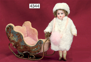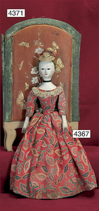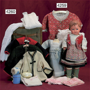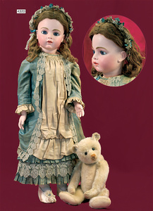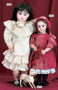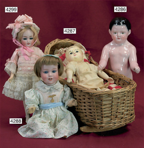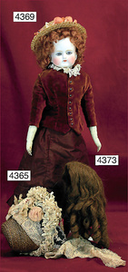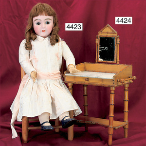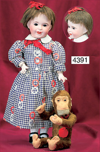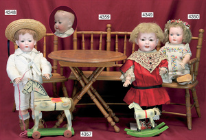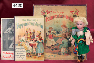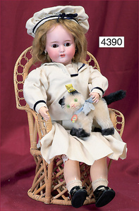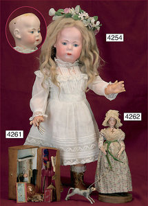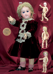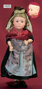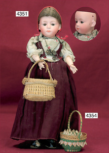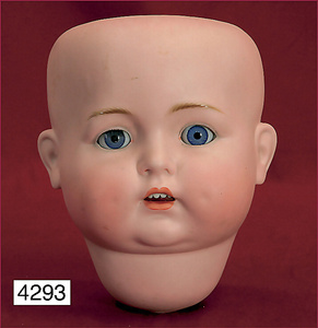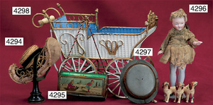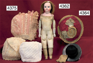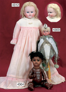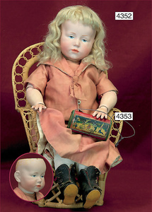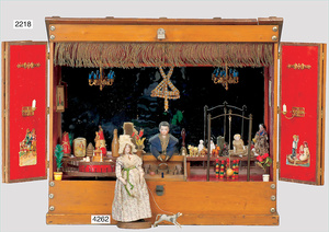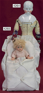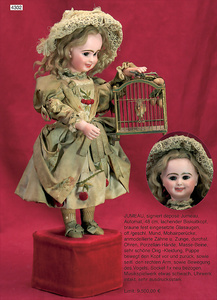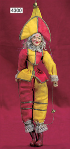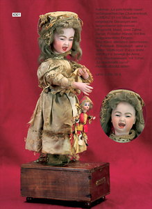 Automat, "Le polichinelle cassé", außergewöhnlicher Charakterkopf, JUMEAU, 51 cm, blaue fest eingesetzte Glasaugen, weit aufgerissener schreiender off./geschl. Mund, oben Zähne, Zunge, Porzellan-Hände, mit fein ausgearbeiteten Fingern, Orig.-Kleid, altersbed. verschlissen, kl. Policinelli, Biskuitkopf, -arme u. -beine, Stoffkörper, Puppe dreht den Kopf u. bewegt die Arme, Orig.-Musikspielwerk, mit Schild, "Le polichinelle cassé", museal, absolut selten
