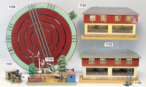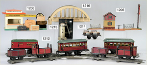 BING Gepäckabfertigung, Gebäude mit Waage, Grundplatte 26 cm breit, 10 cm tief, 13 cm hoch, dazu einige Gepäckstücke, seitl. am Dach Lackfehler, sonst sehr schöner Orig.-Zust., im Orig.-Kart.