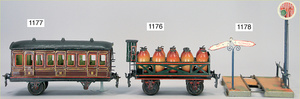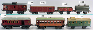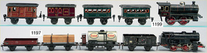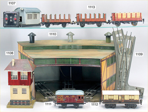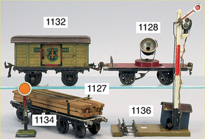 Fundkiste bestehend aus 2x wohl KARL BUB, Int. Expresswagen, Blech lithogr., 20 cm, 4-achiger Gepäckwagen Kraus Vandor, 17,5 cm, 2 Rungenwagen mit Bremserhaus KARL BUB, 2 Hochbordwagen, leicht bespielt, guter Zust., dazu Gleismaterial gerade, gebogen, Weichen, Kreuzungen