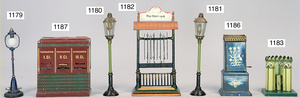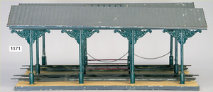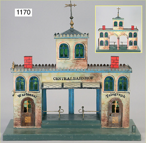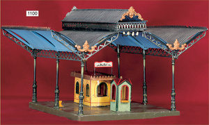 MÄRKLIN Uralt, Bahnsteig mit Wartehalle, Nr. 2044/1, Blech handlackiert, Spur 1, reicht verzierte Well-Knickdächer, auf 6 Profilsäulen, Wartehalle mit Zierdach, Wärterbude u. Pufferhäuschen, 2 Sitzbänke fehlen, Stromanschluss, auf 1 Seite 4 Telegraphen fehlen, etwas altersbed. Lackfehler, Profilsäulen fehlen sind aber als Replika dazu gelegt, unberührter Dachbodenfund, extrem selten