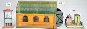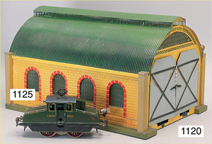 MÄRKLIN Spur 1, 2111/1, Lokschuppen für 2 größere Lokomotiven, 2 Flügeltüren, Steinprägung, Fenster mit Celluloidverglasung, Wellblechdach mit Firstaufsatz, Stirnseite durchbrochen, mit Celluloidverglasung an den Ecken, Säulen mit Kugelaufsatz, 2 Kugelaufsätze fehlen, 57 cm x 40 cm, 1925-1929, insgesamt schöner Orig.-Zust., mit nur kl. altersbed. Lackfehlern, 1 Kugelaufsatz etwas verzogen