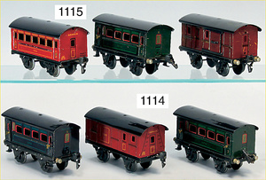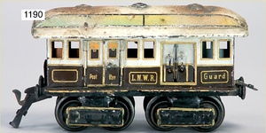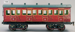 MÄRKLIN Uralt, Personenwagen, Spur 1, amerik. Ausführung, ohne Puffer, wie Wagentyp limited Verstibule Express, jedoch mit grüner Personenwagen-Lackierung, werkseitige Umlackierung, nach dem 1. Weltkrieg, Orig.-Zust. mit Lackschäden